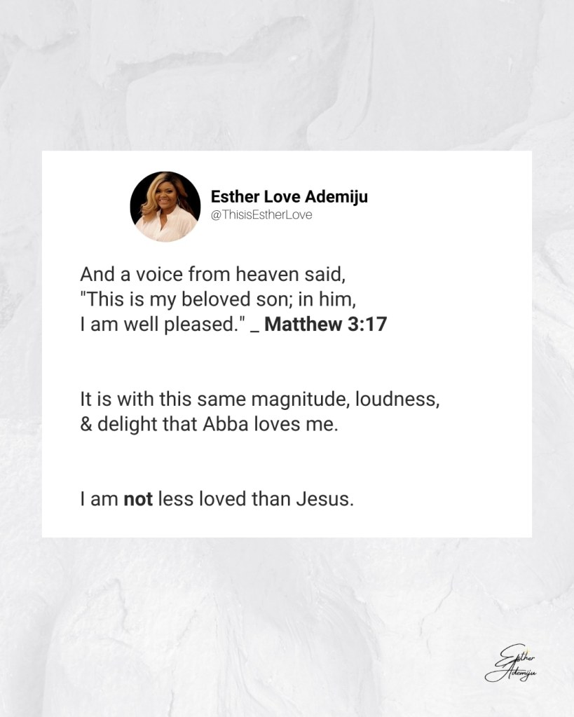 This is a TRUTH: Abba loves you just as much as He loves Jesus. And the knowledge of that love surpasses understanding.